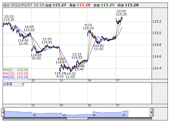 米ドル/円 <5分足> 「株探」多機能チャートより4日のニューヨーク外国為替市場でドル円相場は1ドル=115円26銭近辺と、前日と比べて30銭前後のドル高・円安で取引を終えた。欧州市場では調整売りに押されて114円80銭近辺まで軟化したが、朝方に発表された米国雇用統計が市場予想を上回るとドル買いが強まり、序盤は115円43銭付近まで上昇する場面がみられた。ただ、115円台半ばは1月下旬のリバウンド局面で戻り一服となった水準であり、これが意識されたほか、翌週の米国消費者物価指数(CPI)への警戒感もあって、中盤から終盤にかけては伸び悩んだ。