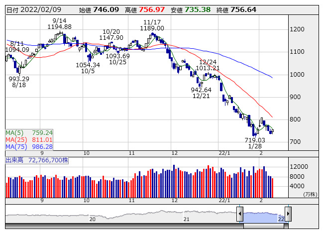 756.64ポイント 9日東証マザーズ指数現物終値