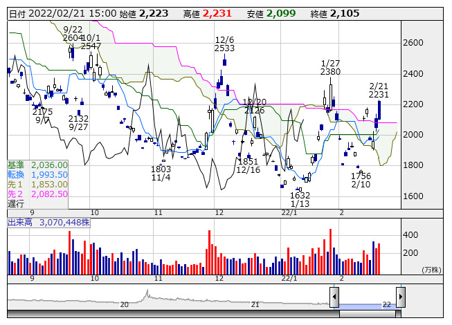 VIX短先物 <日足> 一目均衡表 「株探」多機能チャートより●一目均衡表の【雲】上抜け銘柄(市場人気順) ★2つの先行スパンに挟まれた上値抵抗帯を上抜けた銘柄