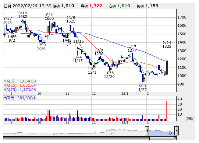 急伸。電子部品からの貴金属回収を手掛ける。ここ最近、金をはじめ貴金属価格の上昇が顕著で、今日も金先物は最高値を更新している。市場では同社の収益押上げ効果を期待した買いが入っているようだ。2月14日に発表した22年9月期第1四半期(21年10-12月)決算は、営業利益が前年同期比3.8倍の2.03億円。前年同期の同4.7倍の0.53億円に続き大幅増益となっており、収益面で評価する向きもあるようだ。