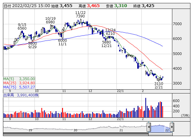 <4385> メルカリ 3425 +180 ( +5.5%)