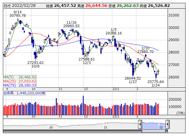 日経平均 <日足> 「株探」多機能チャートより[強弱材料]