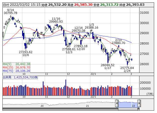 日経平均 <日足> 「株探」多機能チャートより日本取引所が公表した先物手口情報によると、3月2日の日経225先物期近(2022年3月限)の夜間取引(立会内・J-NETの合算)で、買い越しトップはモルガンMUFG証券の546枚、売り越しトップはABNクリアリン証券の634枚だった。