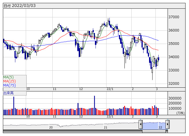 NYダウ <日足> 「株探」多機能チャートより― ダウは96ドル安と反落、ウクライナ情勢を巡る警戒感が払拭せず売り優勢―