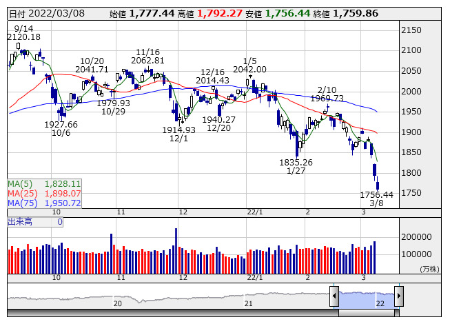 1759.86ポイント 8日TOPIX現物終値