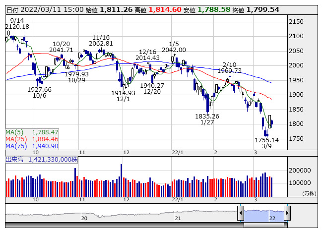 2022年03月11日15時17分 【市況】TOPIX先物:11日清算値=27.5ポイント安、1786ポイント TOPIX <日足> 「株探」多機能チャートより 11日15時15分、TOPIX先物期近2022年6月限は前日清算値比27.5ポイント安の1786ポイントで取引を終えた。出来高は7万3459枚だった。この日のTOPIXの現物終値1799.54ポイントに対しては13.54ポイント安。 株探ニュース