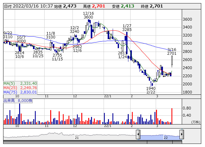 2022年03月16日13時08分 【材料】リグア---ストップ高、上限2万5000株の自社株買い、発行済総数の1.78% リグア <日足> 「株探」多機能チャートより <7090> リグア 2701 +500 ストップ高。2万5000株(0.50億円)を上限とする自社株買いを実施すると発表している。発行済株式総数(自社株を除く)に対する割合は1.78%。取得期間は16日から9月30日まで。自社の役職員に対するインセンティブ・プランに加え、資本効率の向上や経営環境の変化に対応した機動的な資本政策の遂行を可能にすることが目的としている。 《ST》 提供:フィスコ