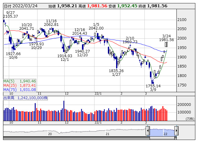 2022年03月25日08時46分 【市況】TOPIX先物:25日寄り付き=10ポイント高、1968.5ポイント TOPIX <日足> 「株探」多機能チャートより 25日8時45分、TOPIX先物期近2022年6月限は前日清算値比10ポイント高の1968.5ポイントで寄り付いた。前日のTOPIXの現物終値1981.56ポイントに対しては13.06ポイント安。夜間取引の終値1974ポイントに対しては5.5ポイント安となっている。 株探ニュース