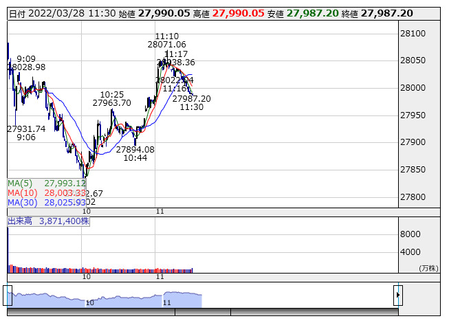 一方、ハイテク株は金利上昇が警戒されて下落し、ナスダック総合指数は-0.15%と小幅反落。金利高を警戒した米ハイテク株安が重しとなるなか、先週末にかけての9連騰からの一服が意識される日経平均は65.76円安でスタート。朝方は売りが先行し、一時27812.67円(337.17円安)まで下落。その後再び28000円を回復する場面もあったが、前引けにかけては再度失速した。