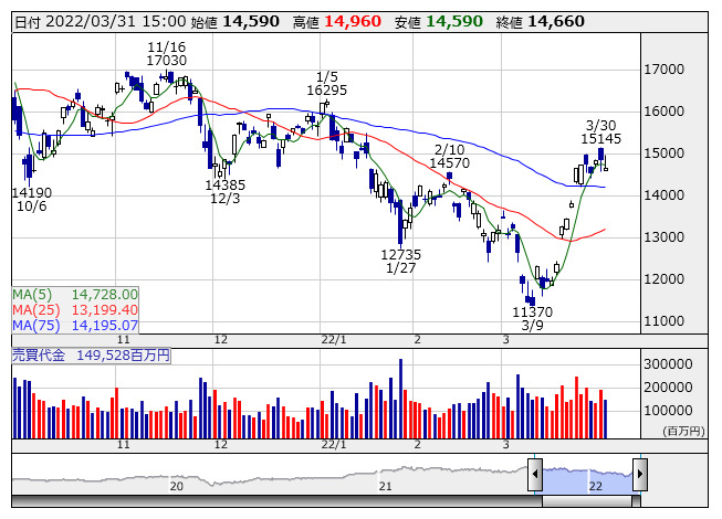 日経レバ <日足> 売買代金 「株探」多機能チャートより売買代金