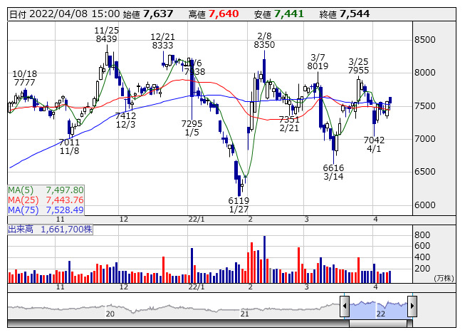 <4507> 塩野義製薬 7544 -25 ( -0.3%) 7497.8 7443.8