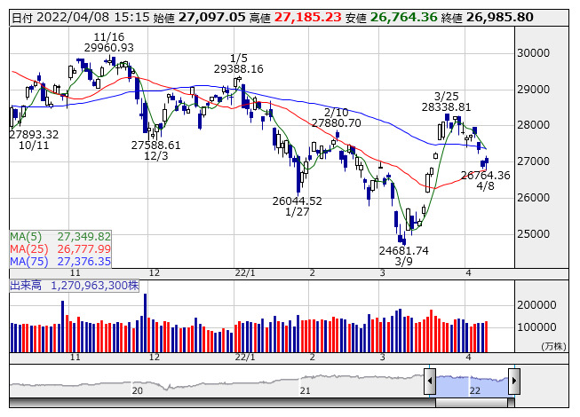 2022年04月08日15時17分 【市況】日経225先物:8日清算値=140円高、2万7040円 日経平均 <日足> 「株探」多機能チャートより 8日15時15分、大阪取引所の日経225先物期近2022年6月限は前日清算値比140円高の2万7040円で取引を終えた。出来高は5万8021枚だった。この日の日経平均株価の現物終値2万6985.8円に対しては54.20円高。 株探ニュース