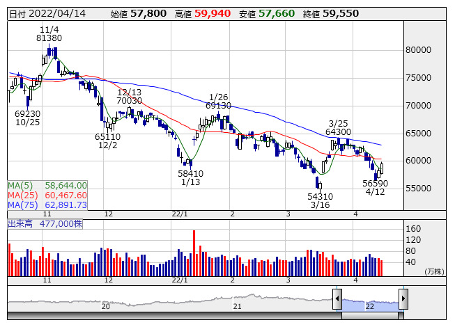 <4704> トレンド 56.76ドル 7145円 (-15円)