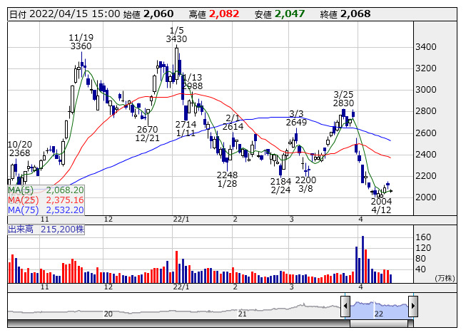 2022年04月15日19時20分 【市況】本日の【自社株買い】銘柄 (15日大引け後 発表分) マルマエ <日足> 「株探」多機能チャートより ○マルマエ <6264> [東証P] 発行済み株式数(自社株を除く)の1.56%にあたる20万株(金額で4億円)を上限に自社株買いを実施する。買い付け期間は4月18日から5月17日まで。 [2022年4月15日] 株探ニュース