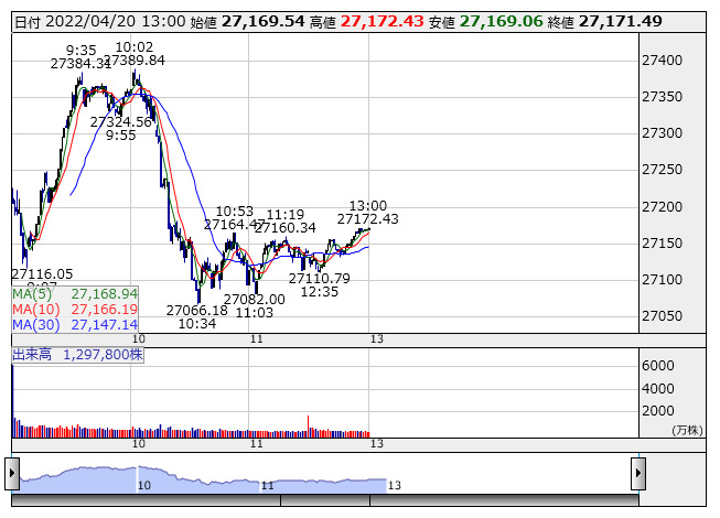 【市況】13時の日経平均は184円高の2万7169円、ファストリが34.44円押し上げ