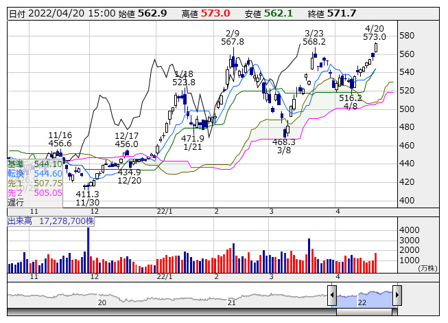 りそなHD <日足> 一目均衡表 「株探」多機能チャートより本特集では、テクニカル指標「一目均衡表」のなかでも最も強い買いシグナルである「3役好転」に注目。プライム市場において、上昇トレンドを示唆した可能性が高い「3役好転」銘柄 38社の中から、予想PERがプライム市場平均の 13.94倍を下回り上値余地があるとみられる 15社を選び出しました。