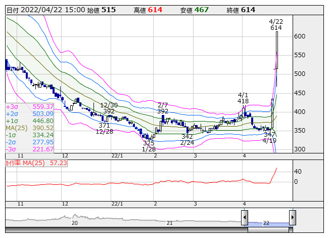 サイステップ <日足> ボリンジャー/カイリ率 「株探」多機能チャートより●株価が+3σを上回った銘柄(市場人気順) ★株価の上げ足が速過ぎ、売りが出やすい銘柄