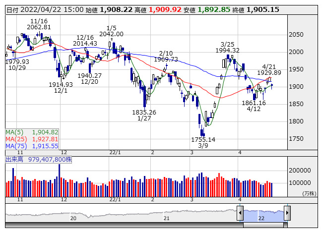 TOPIX <日足> 「株探」多機能チャートより日本取引所が公表した先物手口情報によると、4月22日のTOPIX先物期近(2022年6月限)の夜間取引(立会内・J-NETの合算)で、買い越しトップはHSBC証券の1947枚、売り越しトップはゴールドマン証券の830枚だった。