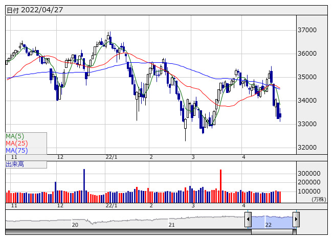 ダウ平均は61.75ドル高の33301.93ドル、ナスダックは1.81ポイント安の12488.93で取引を終了した。ソフトウェアメーカーのマイクロソフト(MSFT)やクレジットカード会社のビザ(V)決算を好感した買いが相場を支え、寄り付き後、上昇。3月中古住宅販売成約指数が予想を下振れ一時下落に転じるも、中国の2都市でコロナ感染が落ち着く兆しとの報道で、世界経済の成長減速への脅威も後退し再び上昇した。値ごろ感から押し目買い意欲も強まり、ダウはプラス圏を維持。ハイテクは金利高を警戒し小幅下落した。セクター別では、ソフトウェアサービスや運宇が上昇した一方、メディア・娯楽が下落。