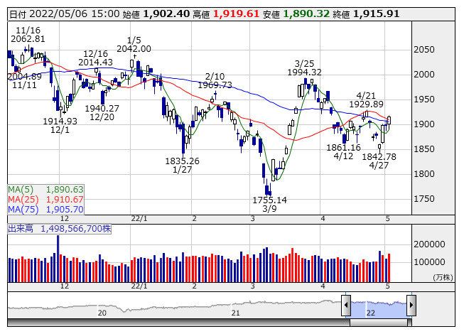 2022年05月06日15時17分 【市況】TOPIX先物:6日清算値=23.5ポイント高、1919.5ポイント TOPIX <日足> 「株探」多機能チャートより 6日15時15分、TOPIX先物期近2022年6月限は前営業日清算値比23.5ポイント高の1919.5ポイントで取引を終えた。出来高は7万3416枚だった。この日のTOPIXの現物終値1915.91ポイントに対しては3.59ポイント高。 株探ニュース