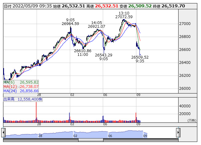 2022年05月09日09時38分 【市況】日経平均の下げ幅が500円を超える 日経平均 <5分足> 「株探」多機能チャートより 日経平均株価の下げ幅が500円を超えた。9時38分現在、507.37円安の2万6496.19円まで下落している。 株探ニュース