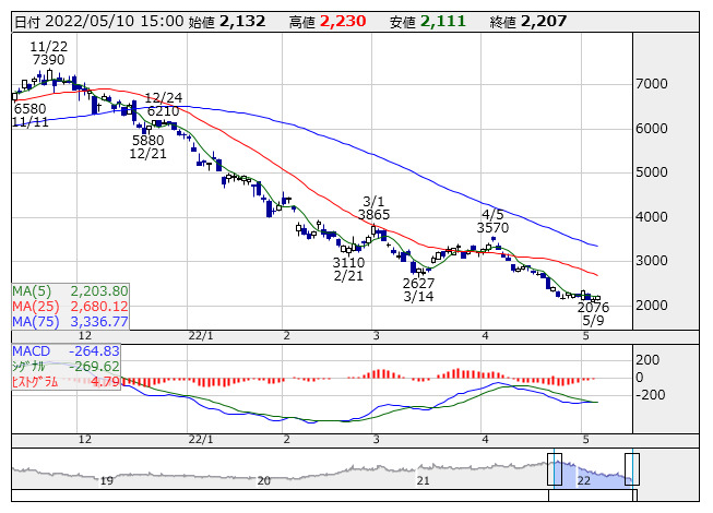 <4385> メルカリ 2207 +75 ( +3.5%) -264.8
