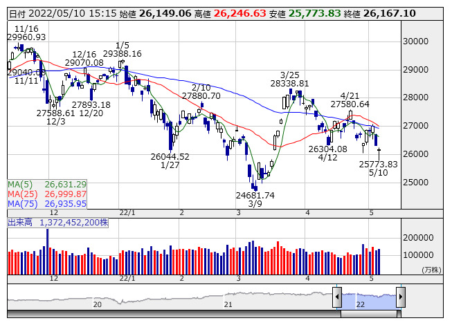 日経平均 <日足> 「株探」多機能チャートより日本取引所が公表した先物手口情報によると、5月10日の日経225ミニ期近(2022年5月限)の日中取引(立会内・J-NETの合算)で、買い越しトップはBNPパリバ証券の6000枚、売り越しトップはソシエテG証券の1万1230枚だった。