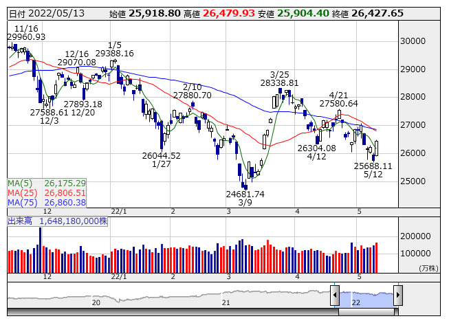 2022年05月14日10時15分 【市況】シカゴ日経平均先物 大取終値比 285円高 (5月13日) 日経平均 <日足> 「株探」多機能チャートよりシカゴ日経225先物6月限 (円建て) 26675 ( +285 ) シカゴ日経225先物6月限 (ドル建て) 26695 ( +305 ) ※( )は大阪取引所終値比 株探ニュース