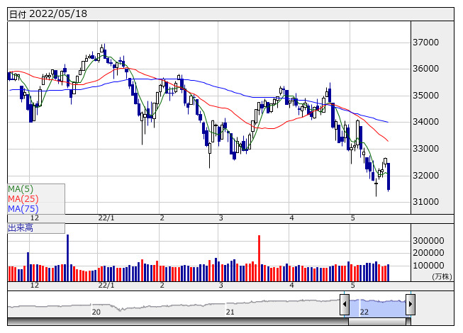 NYダウ <日足> 「株探」多機能チャートよりNYダウ構成銘柄は6銘柄が上昇、24銘柄が下落。S&P500構成銘柄は225銘柄が上昇、279銘柄が下落。市場別ではニューヨーク証券取引所上場株は全銘柄中の47.6%、ナスダック上場株は40.7%が下落と、NY上場銘柄の下落割合が上回った。