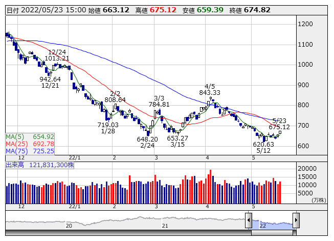 654.80ポイント 5日移動平均