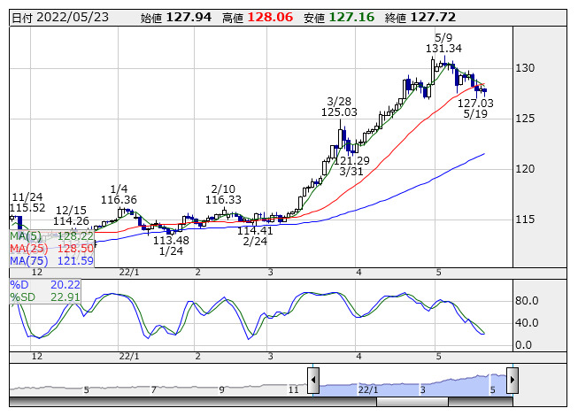 米ドル/円 <日足> Slowストキャス 「株探」多機能チャートより23日のニューヨーク外為市場でドル・円は127円47銭まで弱含んだのち、127円94銭まで上昇し、引けた。