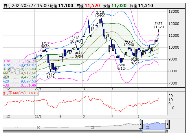 郵船 <日足> ボリンジャー/カイリ率 「株探」多機能チャートより●株価が+3σを上回った銘柄(市場人気順) ★株価の上げ足が速過ぎ、売りが出やすい銘柄
