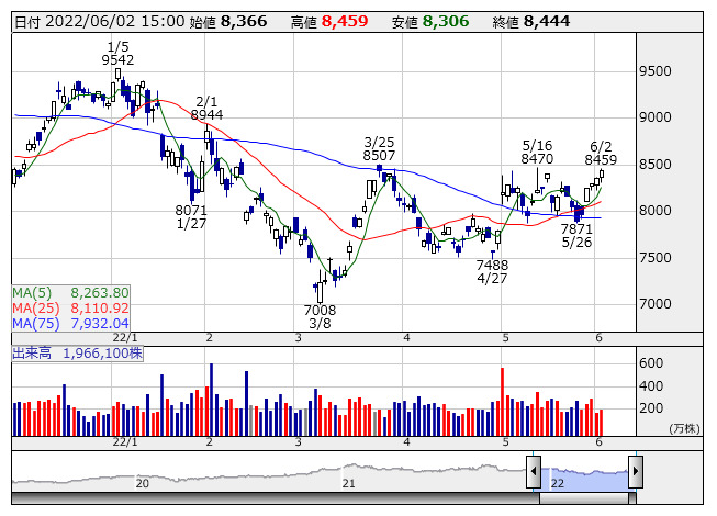 <6981> 村田製作所 8444 +81 ( +1.0%)
