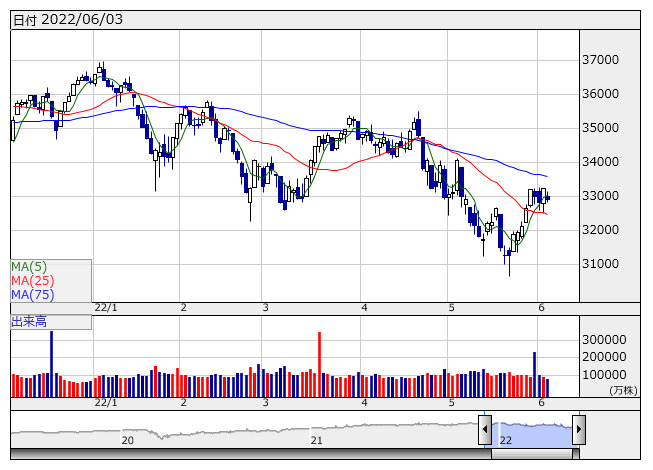 NYダウ <日足> 「株探」多機能チャートより― ダウは348ドル安と反落、強い米雇用統計を受けて金融引き締めを警戒 ―