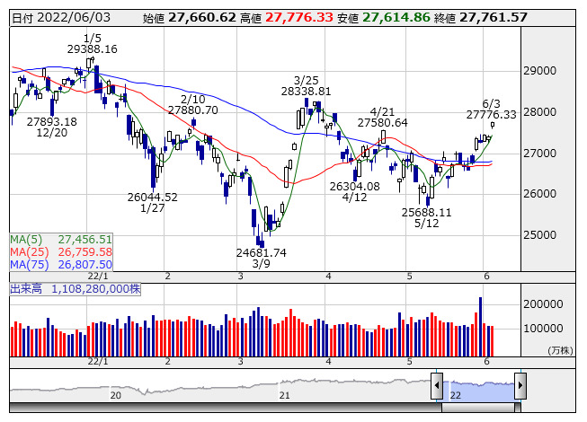 6日の東京株式市場は、主力株を中心に目先利益確定売り優勢の展開となりそうだ。日経平均は2万7000円台半ばまで水準を切り下げる展開が予想される。前週末の米国株市場では主要株指数が揃って下落。注目された5月の米雇用統計は非農業部門の雇用者数の伸びが市場コンセンサスを上回ったことで、FRBによる金融引き締め強化への警戒感が広がり、全体相場の売り材料となった。米10年債利回りが一時2.98%と3%台目前まで上昇したことを受けハイテクセクターへの売り圧力が強まり、ナスダック総合株価指数の下落率の高さが目立った。東京市場では5月下旬以降、日経平均やTOPIXが米株市場の主要株指数と比較して相対的に強い動きを示しているが、きょうも下値では押し目買いニーズが表面化する可能性があり、日経平均の下げ幅は限定的なものにとどまるケースも考えられる。外国為替市場ではドル買いの動きが活発化し、一時1ドル=131円台近辺まで円安が進行したことも、自動車やハイテクなど輸出株には追い風材料となりやすい。
