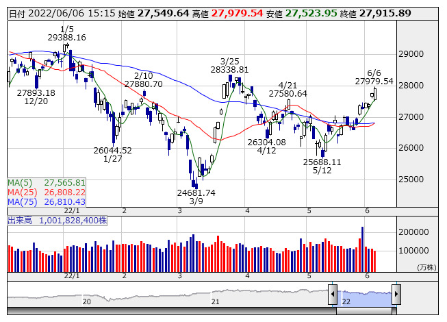 日経平均 <日足> 「株探」多機能チャートより日本取引所が公表した先物手口情報によると、6月6日の日経225ミニ期近(2022年6月限)の日中取引(立会内・J-NETの合算)で、買い越しトップはソシエテG証券の8842枚、売り越しトップはBNPパリバ証券の7140枚だった。