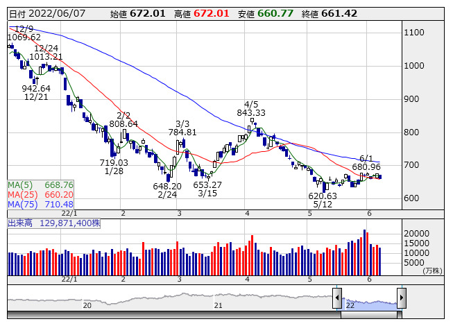 2022年06月08日08時46分 【市況】マザーズ先物:8日寄り付き=8ポイント高、674ポイント マザーズ指数 <日足> 「株探」多機能チャートより 8日8時45分、東証マザーズ指数先物期近2022年6月限は前日清算値比8ポイント高の674ポイントで寄り付いた。前日の東証マザーズ指数の現物終値661.42ポイントに対しては12.58ポイント高。夜間取引の終値672ポイントに対しては2ポイント高となっている。 株探ニュース