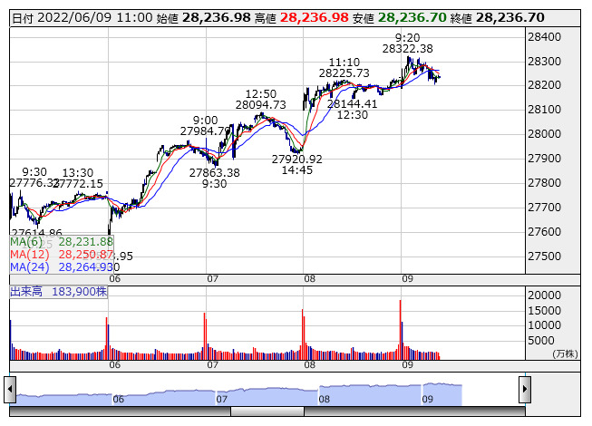 【市況】11時の日経平均は2円高の2万8236円、ファストリが48.50円押し上げ
