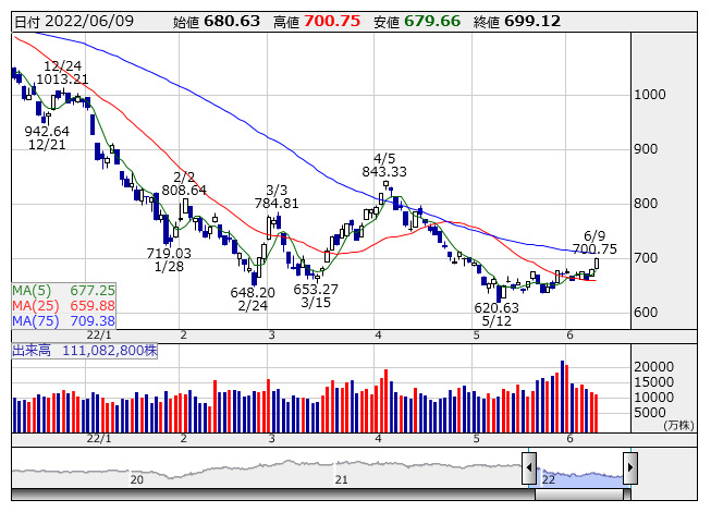 2022年06月10日08時46分 【市況】マザーズ先物:10日寄り付き=9ポイント安、683ポイント マザーズ指数 <日足> 「株探」多機能チャートより 10日8時45分、東証マザーズ指数先物期近2022年9月限は前日清算値比9ポイント安の683ポイントで寄り付いた。前日の東証マザーズ指数の現物終値699.12ポイントに対しては16.12ポイント安。夜間取引の終値682ポイントに対しては1ポイント高となっている。 株探ニュース
