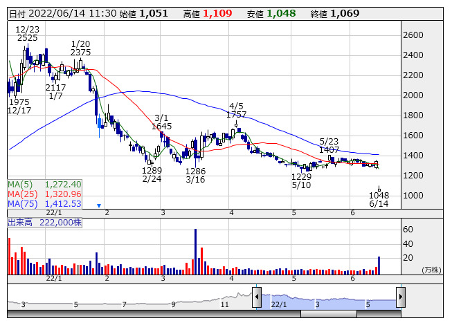 【材料】前場のランキング【値下がり率】 (6月14日)