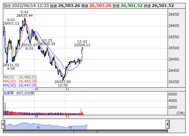 2022年06月14日12時32分 【市況】東京株式(後場寄り付き)=日経平均株価は前場終値比でやや下げ渋る 日経平均 <1分足> 「株探」多機能チャートより 後場寄り付き直後の東京株式市場では、日経平均株価が前営業日比500円安前後と前場終値と比較してやや下げ渋っている。外国為替市場では1ドル=134円40銭台の推移。アジアの主要株式市場は総じて安い。 出所:MINKABU PRESS