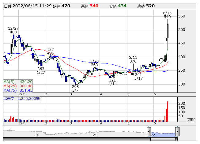児玉化 <日足> 「株探」多機能チャートより児玉化学工業<4222>は13日、2022年度(第96期)から2025年度(第99期)までの4ヶ年を実施時期とする「中期経営計画KCI2025」を策定したことを発表。