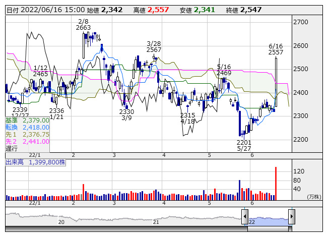 マルハニチロ <日足> 一目均衡表 「株探」多機能チャートより●一目均衡表【3役好転】銘柄(市場人気順) ★強い上昇トレンドに入った可能性が高い銘柄