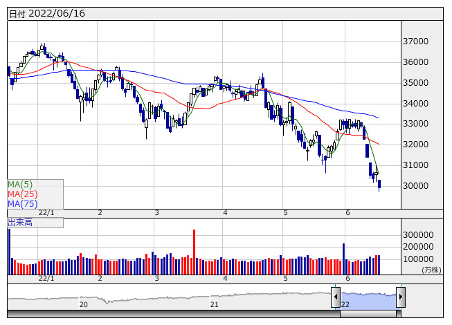 2022年06月17日22時53分 【市況】NYダウの上げ幅が200ドルを超える NYダウ <日足> 「株探」多機能チャートより NYダウ<^DJI>の上げ幅が200ドルを突破。NY時間09時42分(日本時間17日22時42分)現在、201.45ドル高の3万128.52ドルまで上昇している。 株探ニュース