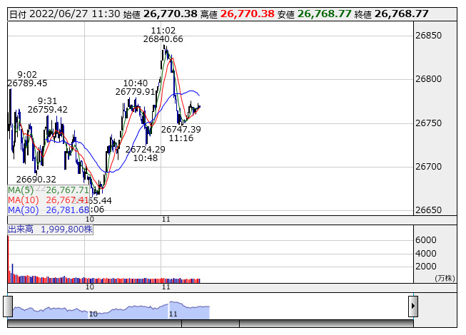 日経平均 <1分足> 「株探」多機能チャートよりきょう前場の東京株式市場は、戻り相場の地合いが継続した。前週末の欧州株市場が全面高に買われたほか、米国株市場ではハイテク株や金融株が大きく買われ、NYダウが800ドルを超える上昇をみせるなどリスク選好の動きを強めた。市場のセンチメントが改善した東京市場も、これに追随する格好となった。ただ、日経平均は一時300円を超える上昇をみせたが、2万6000円台後半では戻り売り圧力も観測され、前引けはやや上げ幅を縮小している。個別ではプライム市場全体の63%の銘柄が値を上げた。