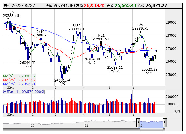 28日の東京株式市場は、足もと強弱観対立の中も戻り売り圧力が優勢となり、日経平均株価は弱含みで推移する可能性が高そうだ。ここ戻り足を強めていた欧州株市場だが、前日は主要国の株価指数が高安まちまちの展開だった。また、米国株市場でもNYダウ、ナスダック総合株価指数がいずれも小幅ながらマイナス圏で引けており、上昇一服感がみられる。これを受けて、東京市場でも上値を積極的に買い進む展開は期待しにくい。米国ではFRBによる金融引き締め強化の動きを背景に、経済のハードランディングに対する警戒感が依然として根強いほか、目先は米10年債利回りが上昇傾向を示し、高PERのグロース銘柄を中心に上値を重くした。ただ、下値では押し目買い需要も強く、主要株価指数の下げは小幅にとどまっている。日経平均は前週末と週明けの2営業日合計で700円の上昇をみせており、いったんキャッシュポジションを高める動きが出やすいが、米国株同様に下値抵抗力を発揮し、2万6000円台後半で底堅い動きが予想される。