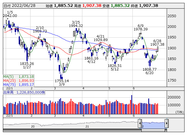 2022年06月29日08時46分 【市況】TOPIX先物:29日寄り付き=17ポイント安、1890.5ポイント TOPIX <日足> 「株探」多機能チャートより 29日8時45分、TOPIX先物期近2022年9月限は前日清算値比17ポイント安の1890.5ポイントで寄り付いた。前日のTOPIXの現物終値1907.38ポイントに対しては16.88ポイント安。夜間取引の終値1889ポイントに対しては1.5ポイント高となっている。 株探ニュース