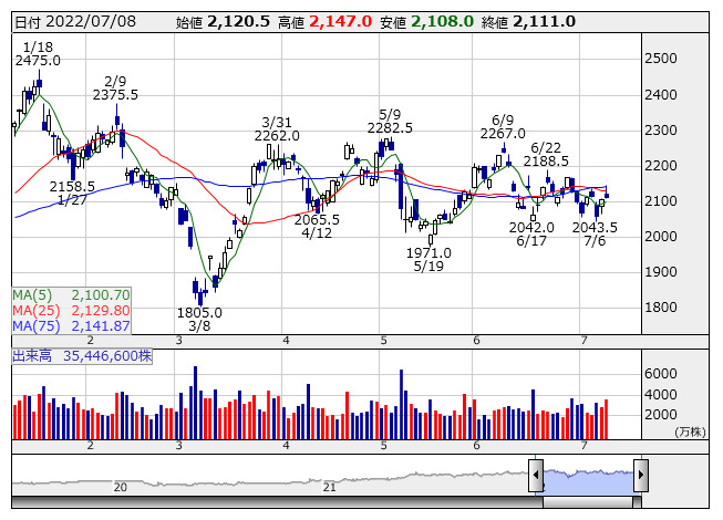 ダウ平均は46.40ドル安の31,338.15ドル、ナスダックは13.96ポイント高の11,635.31で取引を終了した。6月雇用統計で雇用者数の伸びが予想を大きく上回り、平均賃金の伸びも小幅ながら予想を上回ったことで労働市場の堅調さが確認された。同時に強まった金融引き締めの強化を警戒した売りが先行し、寄り付き後は下落。一方で金利の上昇が限定的だったことや、景気後退懸念の緩和を背景とした押し目買い意欲も強く、上昇に転じる場面もあった。結局、指数は方向感が定まらず、ダウ平均は小幅下落で終了。ナスダック総合指数は小幅にプラスで終え、5日続伸となった。