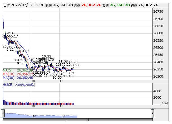 日経平均 <1分足> 「株探」多機能チャートより日経平均 : 26362.76 (-449.54)