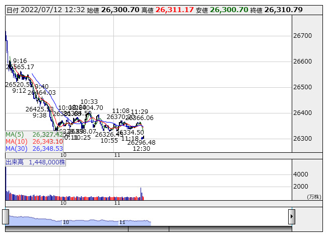 2022年07月12日12時31分 【市況】東京株式(後場寄り付き)=日経平均株価は前場終値比で一段安 日経平均 <1分足> 「株探」多機能チャートより 後場寄り付き直後の東京株式市場では、日経平均株価が前営業日比510円安前後と前場終値と比較して一段安。外国為替市場では1ドル=137円10銭台の推移。アジアの主要株式市場は総じて軟調。 出所:MINKABU PRESS